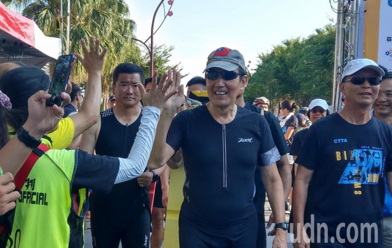 馬英九到宜蘭梅花湖參加鐵人三項比賽,與選手跟工作人員擊掌打招呼,互喊「加油」。(圖片來源:記者戴永華/攝影)