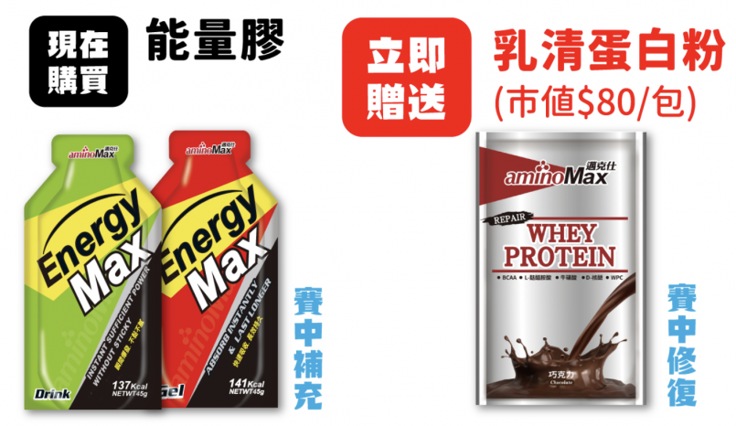 - 運動筆記推出跑者修復組合【aminoMax】Energymax 能量膠組合 加贈 乳清蛋白修復飲,讓你同時在賽中補充能量,賽前、賽後也能修復肌肉喔!