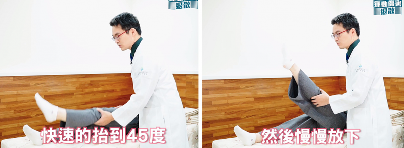在躺平的狀態下,將大腿快速抬至45度,然後慢慢放下。在過程中如果頓一下、頓一下的,那就代表大腿的控制能力不太好,需要訓練一下。