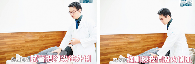 如同訓練大腿的動作,需躺平,加入將腳尖像外倒的動作,再快速抬升至45度,緩緩放下,如此一來也可以順利訓練股內側肌的力量。