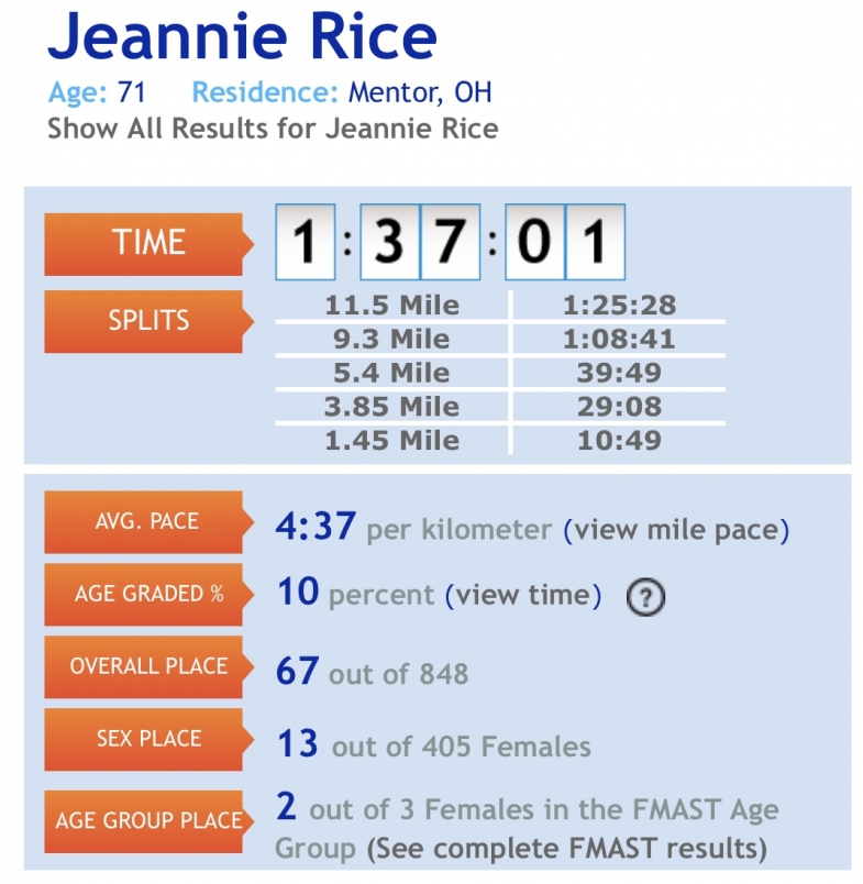 Congratulations to 71-year-old Jeannie Rice of Mentor who unofficially set a new age group world record during the @Goodyear_News Half Marathon yesterday, running the 13.1 miles in 1:37:07!