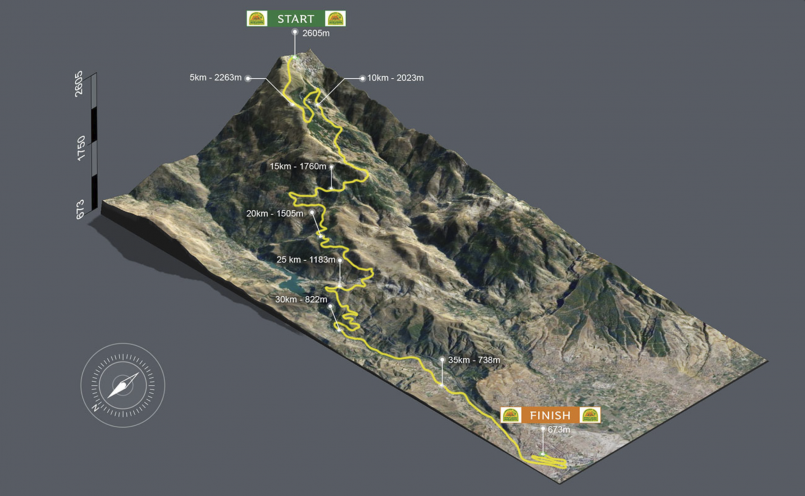 這場馬拉松主辦單位命名為·「世界最速馬拉松」在西班牙內華達山開跑,一路完全下坡,從海拔 2605 公尺滑到海拔 673公尺的格拉納達,以4.2%的坡度下降將近 2000公尺。