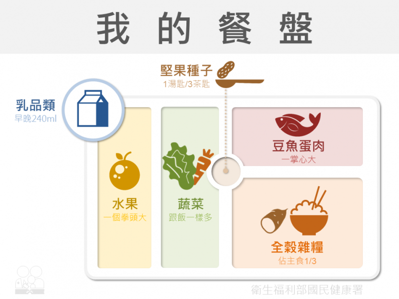 國民健康署依據每日飲食指南,設計了視覺化的模擬餐盤,用不同的面積大小,涵蓋了六大類食物的份量,我們將餐盤重畫,並註記上關鍵資訊,希望讓大家一餐的取菜方式更有概念喔!