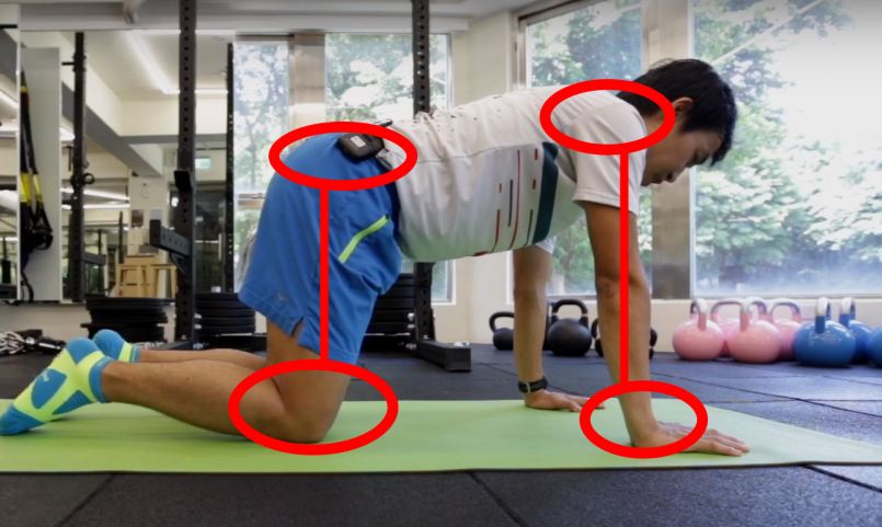 1.四肢貼地,雙手位於肩關節正下方;雙膝位於髖關節正下方。