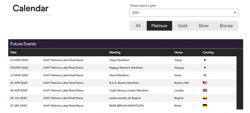 根據 IAAF官網 最新資料顯示,2020 年的白金標認證賽事共有 7 個,分別是東京馬拉松、名古屋女子馬拉松、首爾馬拉松、波士頓馬拉松、倫敦馬拉松、波哥大半程馬拉松以及柏林馬拉松。