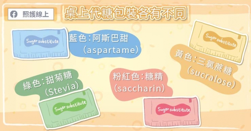 如果去美國遊玩,你會發現餐桌上放著一包包的糖,讓人於喝咖啡、喝茶時添加,它們的包裝顏色就分別代表著是不同的代糖: