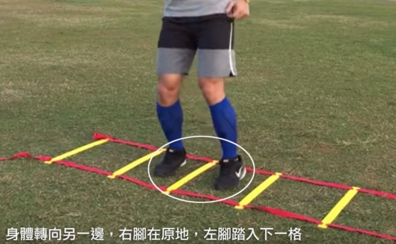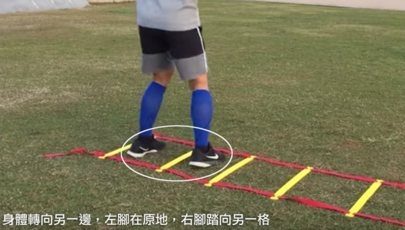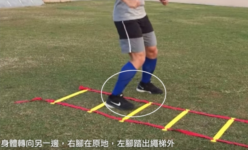 Step3. 身體轉向另一邊,右腳在原地,左腳踏出繩梯外。