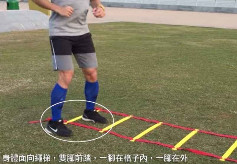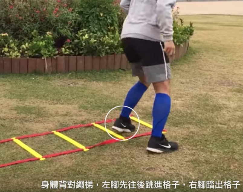 Step1.身體背對繩梯,抓好距離,先從左腳開始跳進格子,右腳踏出格子。
