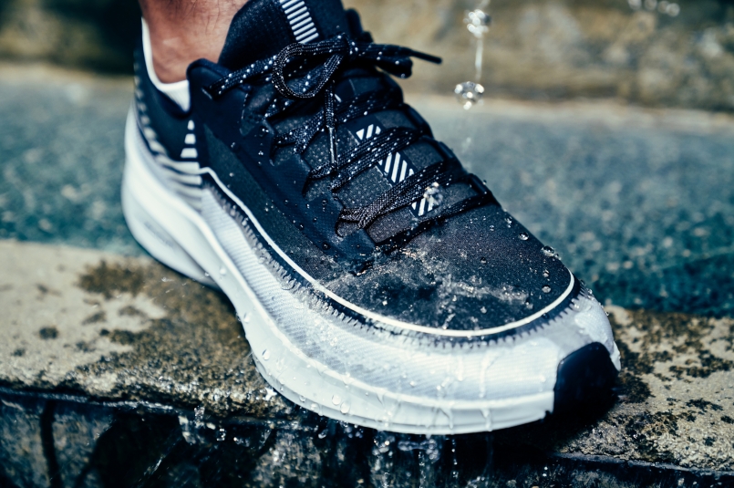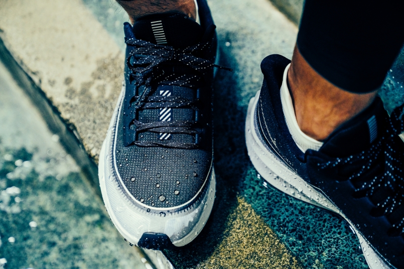 防潑部分,鞋面強化接縫處密合度以及內外抗水塗層,讓雨⽔不會滲透,下雨天也可保持乾爽舒適。鞋身部分更採用 360 度反光設計,強化提升跑者在夜間可見度!
