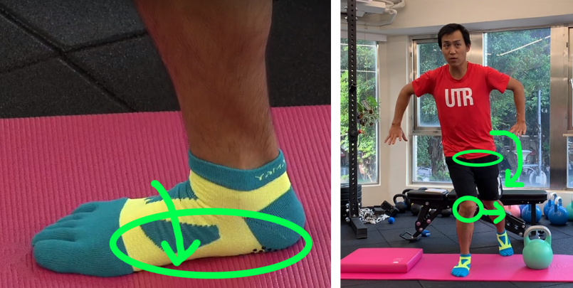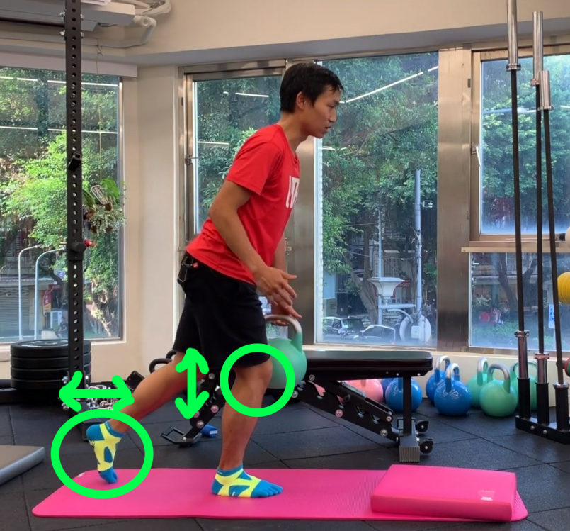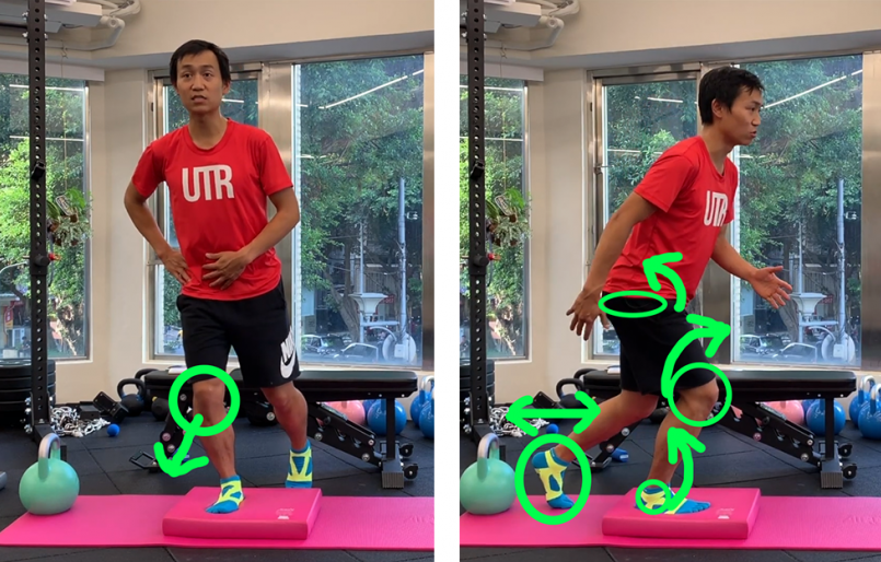 首先我們訓練會希望是在一個類似於跑步的姿態底下操作,讓各位在閉鎖關節動作下練習,同時會鍛鍊到我們踝關節的足弓穩定、髖外展肌群的力量以及核心肌群的力量,避免膝關節出現內扣的情況。