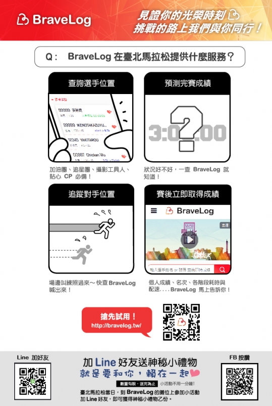 由富邦與台灣鐵人三項公司合作推出,工研院、AMIS帳聯網公司及微軟聯手打造的全球運動區塊鏈應用首例—BraveLog,今年也有與臺北馬拉松合作推出多項跑者服務。除了可以查詢選手位置、預測完賽成績以蔡,賽後還能即時取得成績,可以說是相當便利的線上工具。