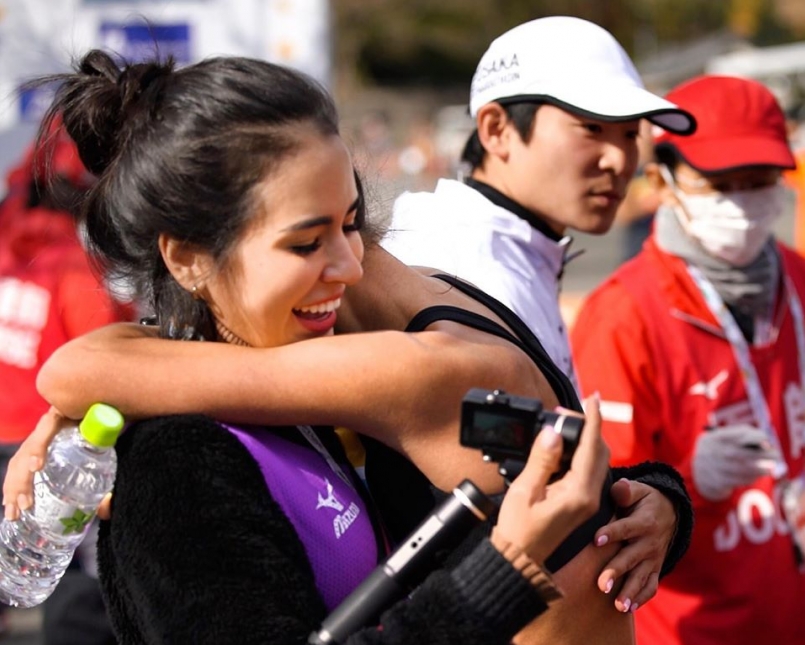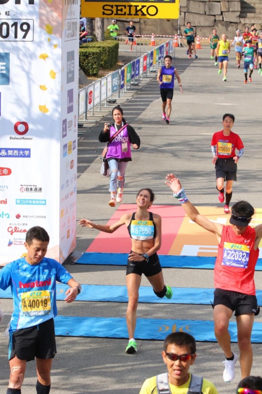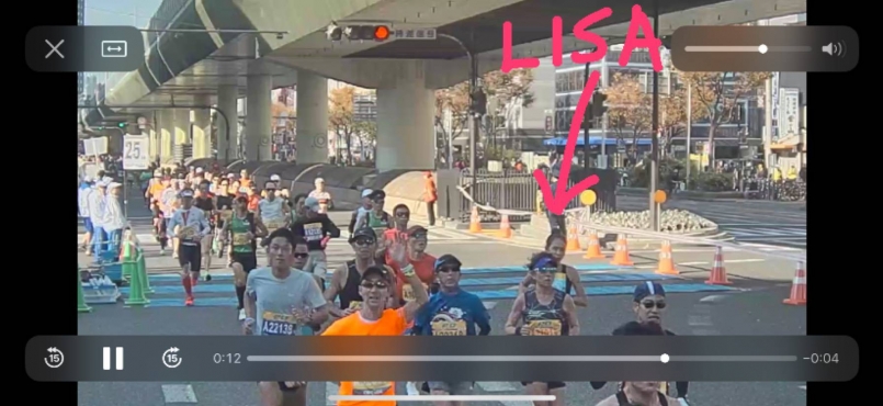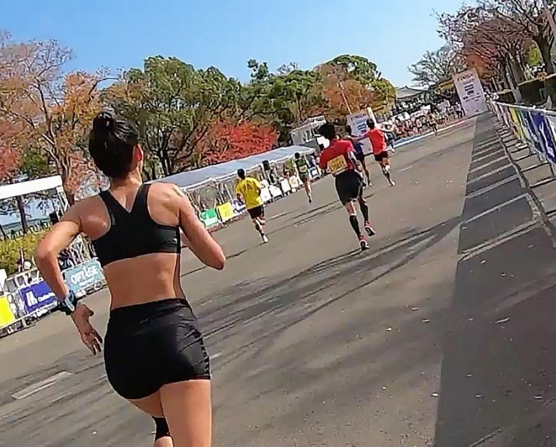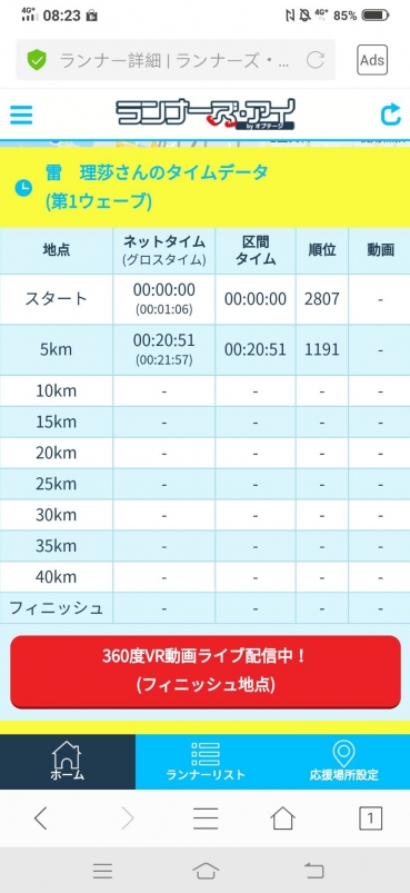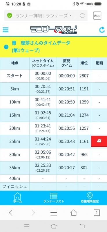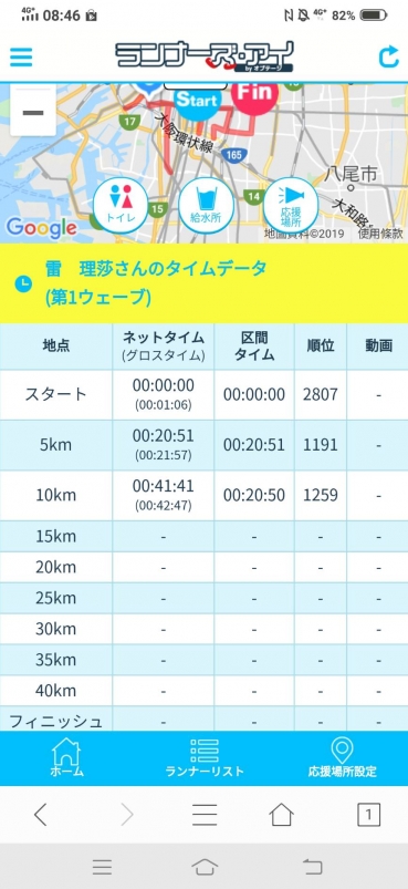 日本當地時間上午 9 點起跑,想當於台北時間上午 8 點,相信她的家人、朋友、粉絲們,無不準時透過官網追蹤系統,追蹤 No.87650 的一舉一動,等待期間總是難熬又充滿期待,終於台北時間 08:23 傳出第一則資訊,她從 A 區 2807 人當中,以 20 分 51 秒通過第一區段 5 公里,排名也首度來到 1191 名。看到瞬間終於真實感受,哇!她終於出發了,終於如願以償跑出去了,而且此速率比原定配速,僅慢 1 秒真是精準,真期待她第二區段成績。