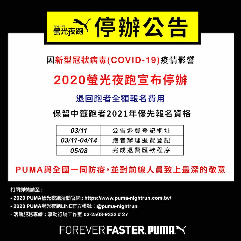 親愛的跑友,感謝您對於臉部平權運動臺北國道馬拉松的支持因考量新冠肺炎疫情還在持續中,本會經過整體評估,為了保障國內外選手的安全,原訂今年3月8日舉辦的臉部平權運動臺北國道馬拉松,決定延期舉辦,因延期不克參賽者請於3月28日前向本會提出申請,本會將採報名費全額退費,若未於3月28日前提出申請者,本會視同參賽者同意保留原報名名額,相關退費辦法將依據活動辦法規定進行,而原本已於1月21日至2月26日這段時間有提出申請退費者本會也採全額退費不須額外申請,此要請報名的跑友多多體諒與包涵希望大家共體時艱、齊心協力配合中央共同防疫,早日恢復正常生活,後續辦理日期近期公告。