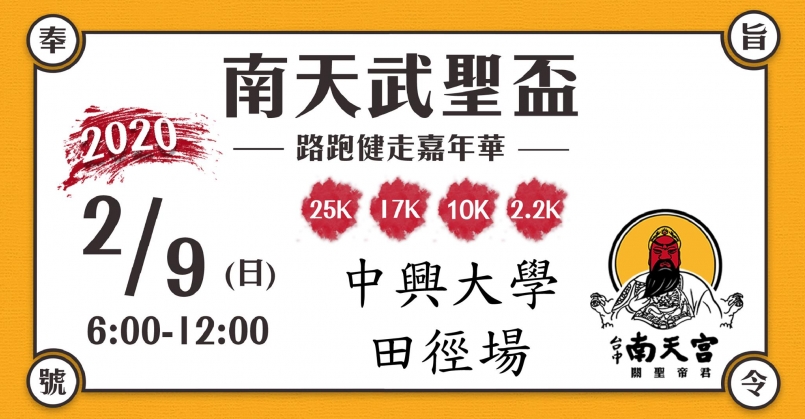 因應武漢肺炎疫情持續擴散,在防疫期間,奉臺中市政府指示延後辦理大型體育活動,因此原訂2月9日舉辦的『2020南天武聖盃路跑健走嘉年華』將延後至5月份舉行,確切的日期以及後續處理,將於近日內於報名網站及臺中市北區體育會FB粉絲專頁公告。