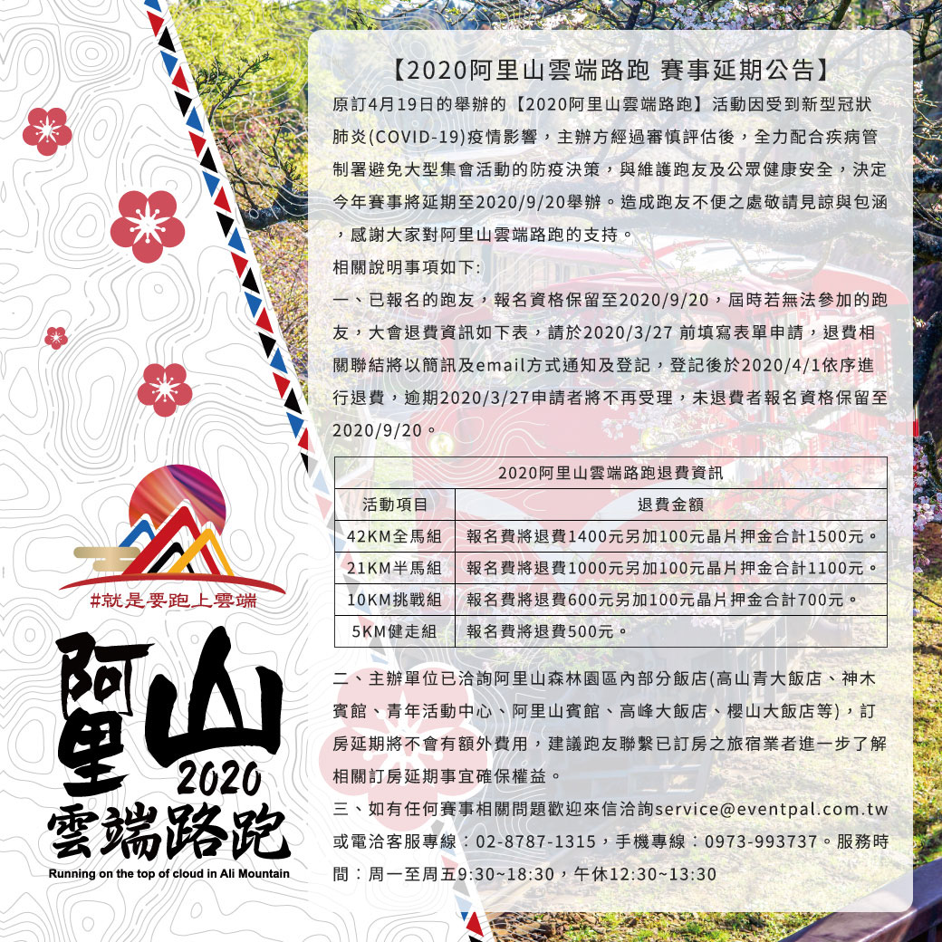 原訂4月19日舉辦的「2020阿里山雲端路跑,因受到新型冠狀肺炎(COVID-19)疫情影響,主辦方經過審慎評估後,全力配合疾病管制署避免大型集會活動的防疫決策,與維護跑友及公眾健康安全,決定將今年賽事延期至2020/9/20舉辦。