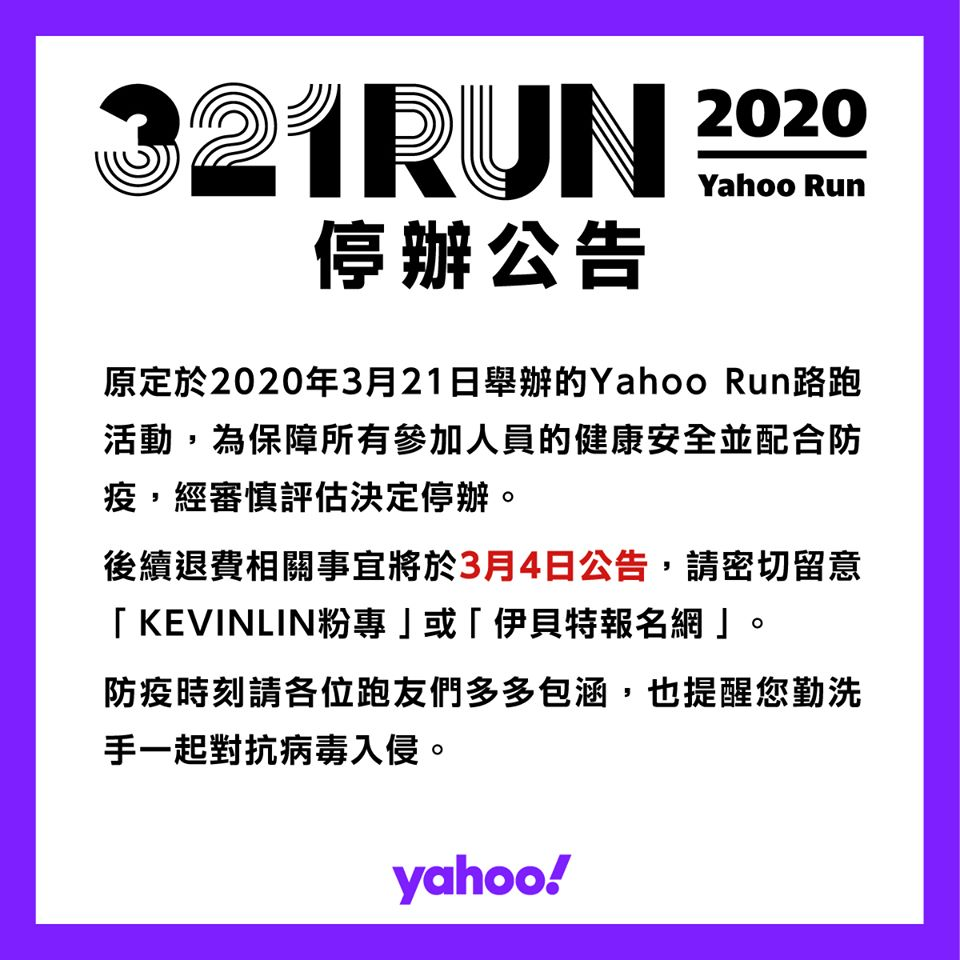 原定於2020年3月21日舉辦的Yahoo Run路跑活動,為保障所有參加人員的健康安全並配合防疫,經審慎評估決定停辦。 後續退費相關事宜將於 #3月4日公告,請密切留意「KEVINLIN粉專」或「伊貝特報名網」。 防疫時刻請各位跑友們多多包涵, 也提醒您勤洗手一起對抗病毒入侵。
