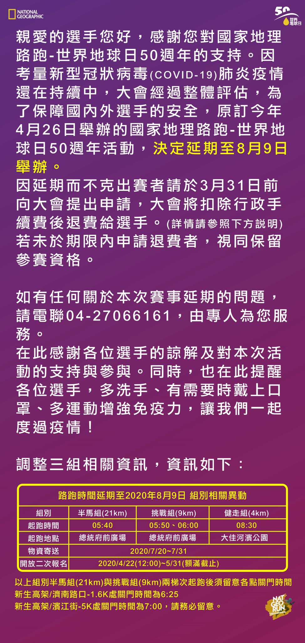 因武漢疫情~為跑友健康顧慮及(主會場在學校)安全考量、決定延期至10月18日(星期日)舉辦。