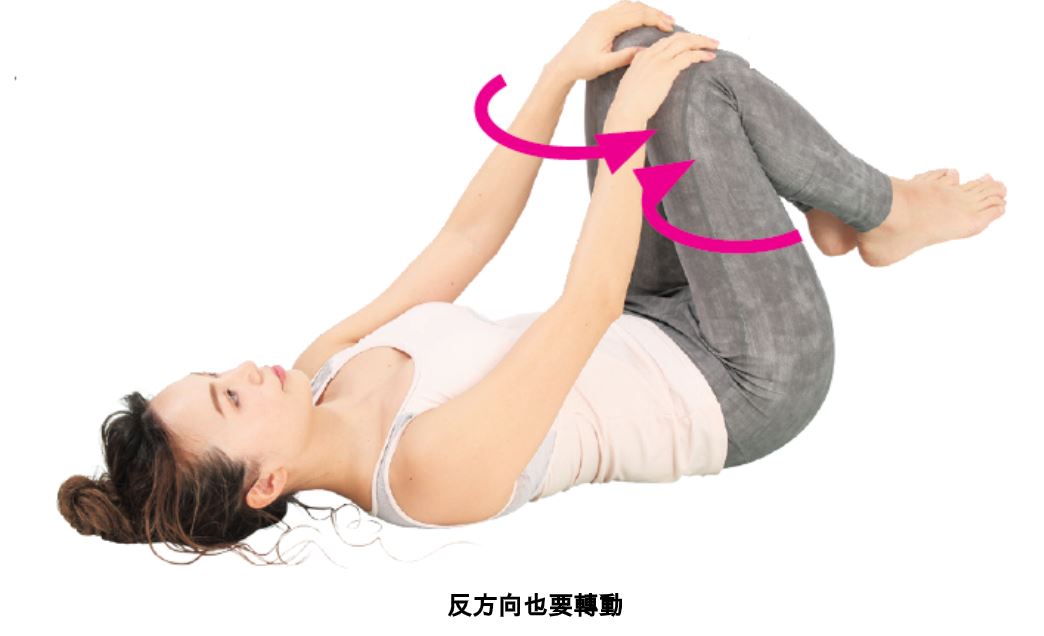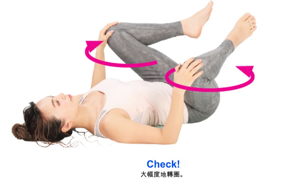 以右手抓住右側膝蓋、左手抓住左側膝蓋,由內側往外側慢慢轉 8 圈。