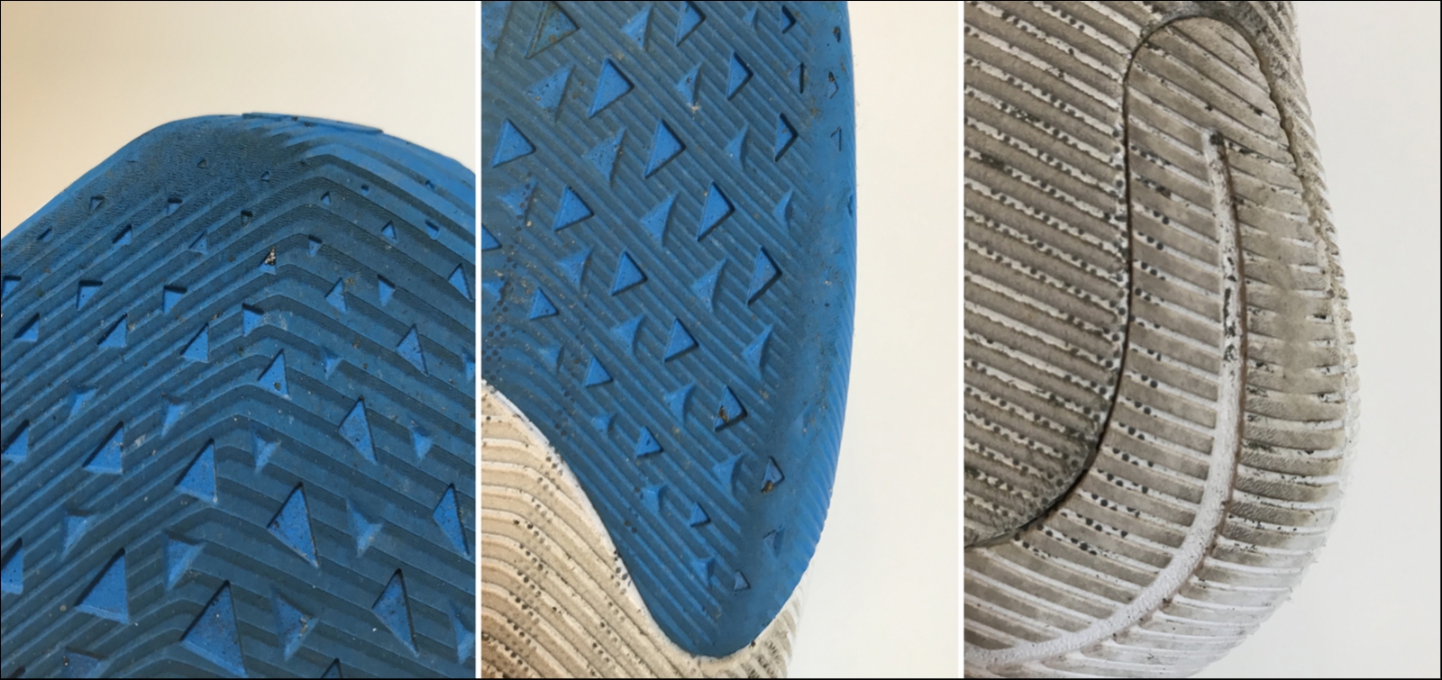 在跑過100公里的各種地形和路面後,加上我暴力的腳刀跑法(腳底外側著地),耐磨度粗估為跑鞋市場裡中上水準,除了外側著地和推蹬離地的鞋頭有磨損,其他部分還完好如初,外底材質的堅韌可見一斑,但也是跟輕量化作的交換。