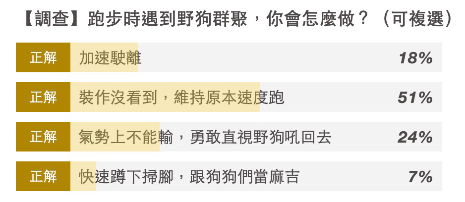 雖然狗狗是人類的好夥伴,但是在河濱跑步遇到野狗群聚,還是讓人「心驚驚」。日前,運動筆記做了一項調查,問大家跑步遇到野狗會怎麼做,發現「裝作沒看到,維持原本速度跑」的人最多(51%);第二多的是「氣勢上不能輸,勇敢直是野狗吼回去」(24%);第三多的是「加速駛離」(18%)。