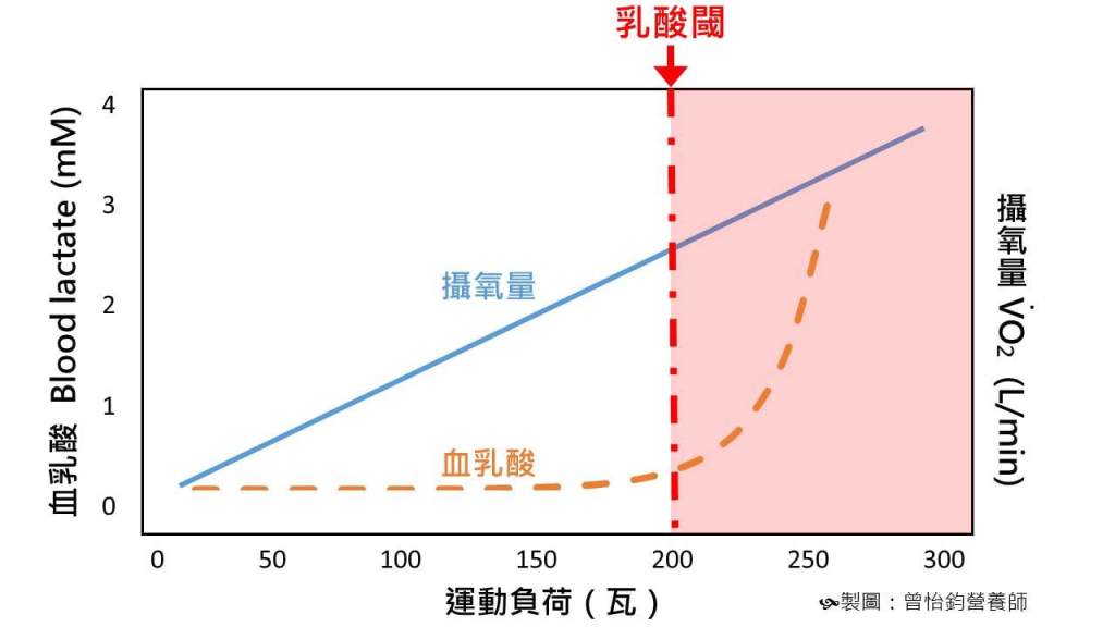 此時身體改以利用“無氧代謝”來提供主要比例的能量來源遠大於“有氧代謝”,當乳酸的生產速率超過移除速率時,組織內的乳酸濃度提高,使得血液中的乳酸值增加並隨著無氧代謝地進行會逐漸接近乳酸閾值。