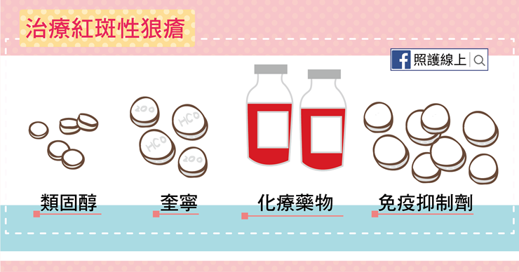 對付紅斑性狼瘡造成的身上紅疹時,醫師常建議先擦類固醇藥膏。當身體其他器官遭受自體免疫抗體攻擊時,較高劑量的口服或注射型類固醇能減少器官發炎反應。