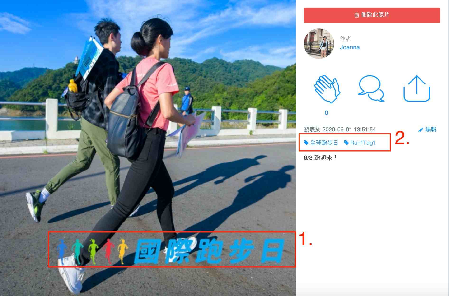 (1)選擇發佈在每日照片區:使用「國際跑步日」貼圖,並 hashtag 「#全球跑步日」、「#Run1Tag1」