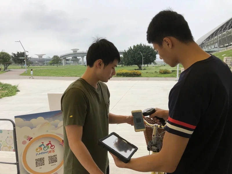 民眾用行動支付租借腳踏車,還可參加抽獎活動。(圖片來源:新北市高灘地管理處提供)