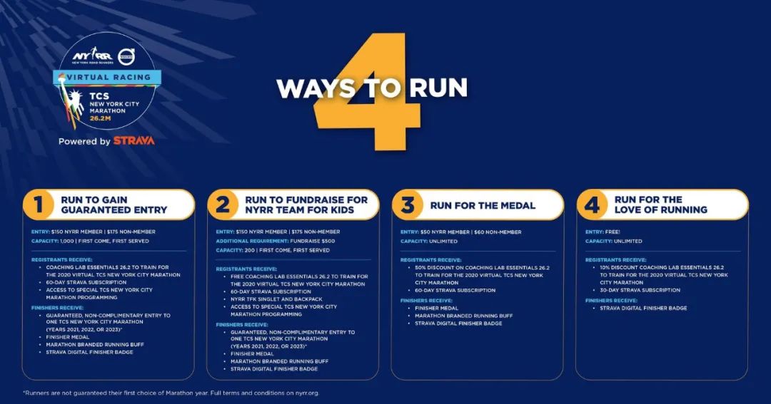 紐約馬拉松的線上馬拉松將於 10 月 17 日至 11 月 1 日舉行。跑者必須通過 NYRR 註冊,並將 NYRR 帳戶連接到 Strava 來記錄跑步時間,參賽者必須在 8 小時內完成 26.2 英里的全程馬拉松。免費報名 "Run For the Love of Running" ,可以獲得虛擬完賽徽章,如果想獲得獎品,需要至少註冊「Run for the medal」,NYRR 會員需要50美元,非會員需要 60 美元。