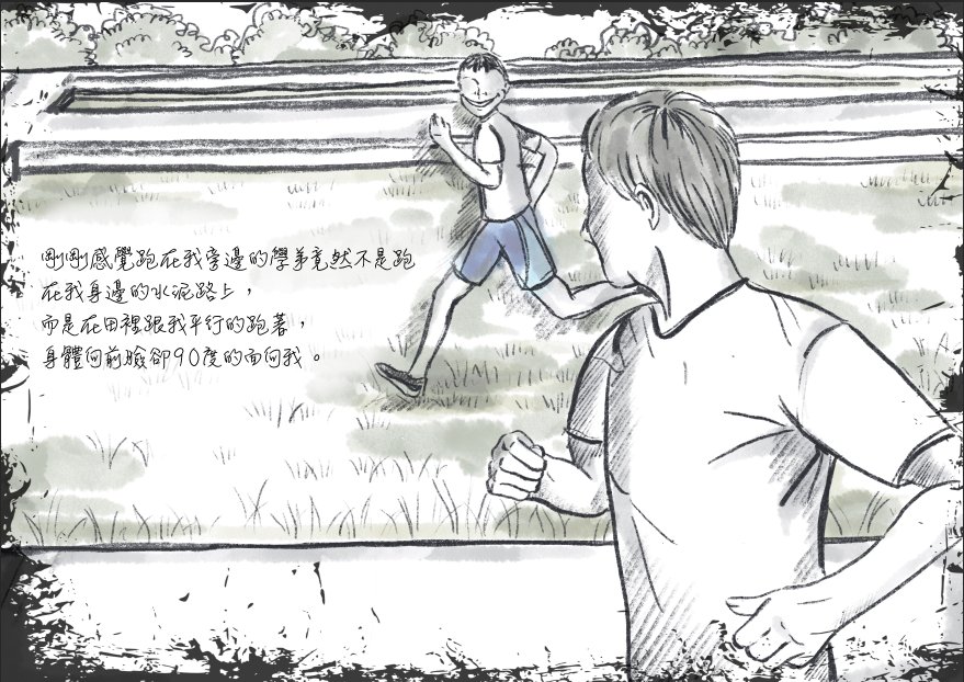 背後的腳踏車聲音還在繼續,但我眼睛往旁邊飄,剛剛感覺跑在我旁邊的學弟竟然不是跑在我身邊的水泥路上,而是在田裡跟我平行的跑著,身體向前臉卻 90 度的面向我,那距離好歹離我也有 5-6 公尺,為什麼我剛剛會一直覺得他跑在我旁邊跟我講話…?