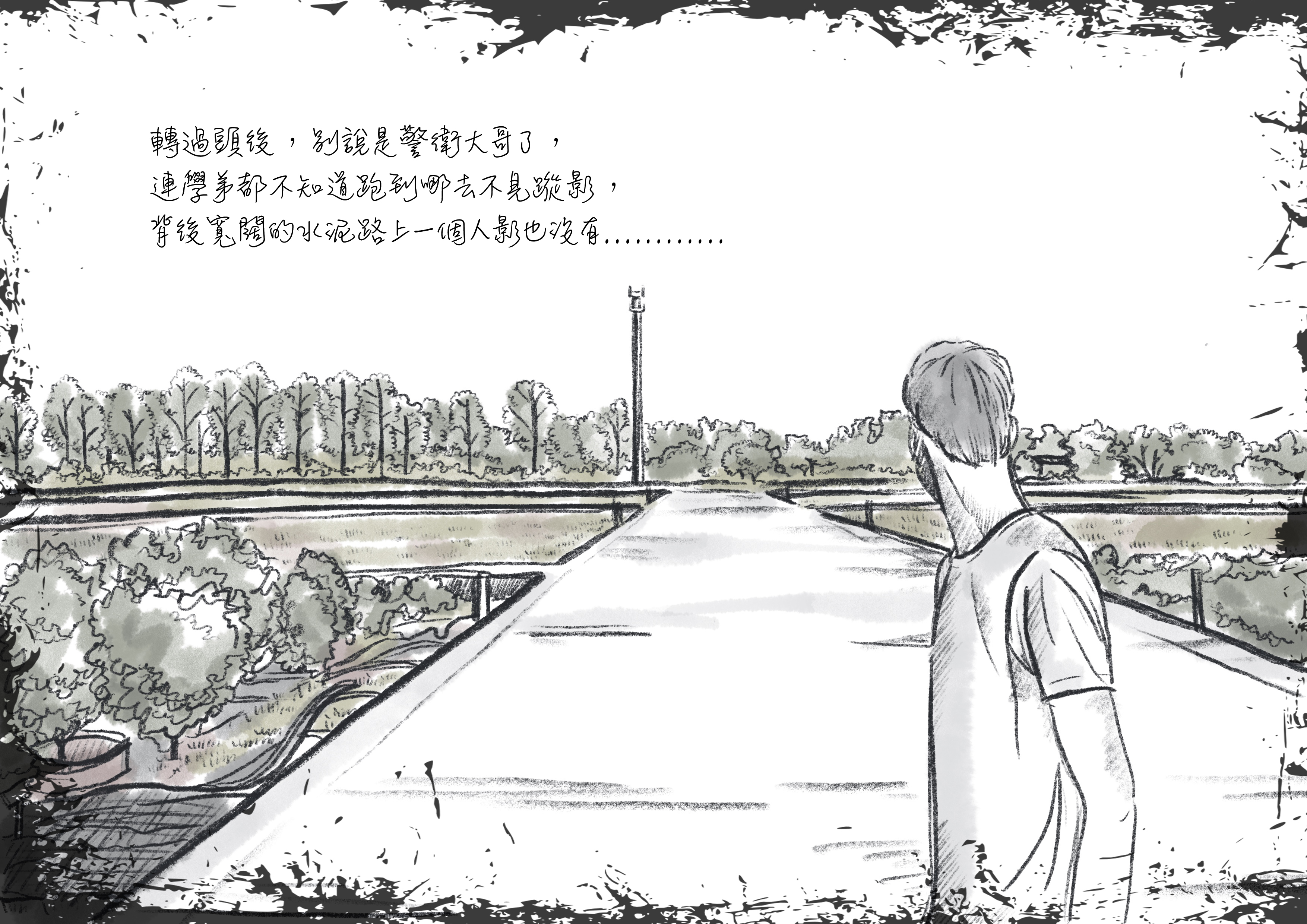 但轉過頭後,別說是警衛大哥了,連學弟都不知道跑到哪去不見蹤影,背後寬闊的水泥路上一個人影也沒有,我心裡覺得怪怪的,但因為是傍晚的關係,我並沒有往太恐怖的方向去想,只覺得自己或許是聽錯機器運轉的聲音以為是有人在我背後騎腳踏車。