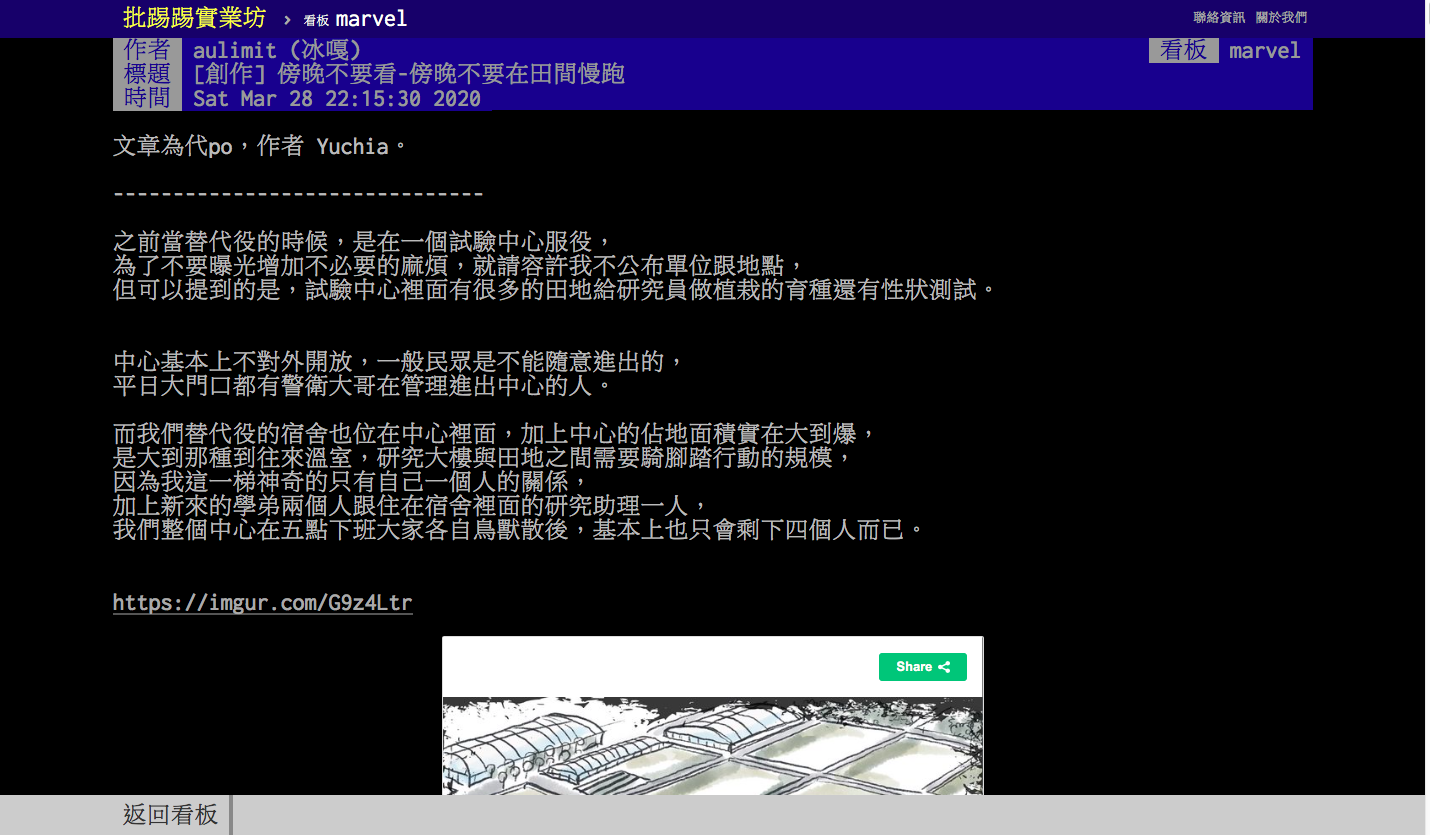 我們兩個一邊鬼叫一邊往宿舍的方向衝去,連頭都不敢回,等到我們拉開宿舍的玻璃大門進到室內,快速地把門鎖上之後,只看到那個東西站在田裡。