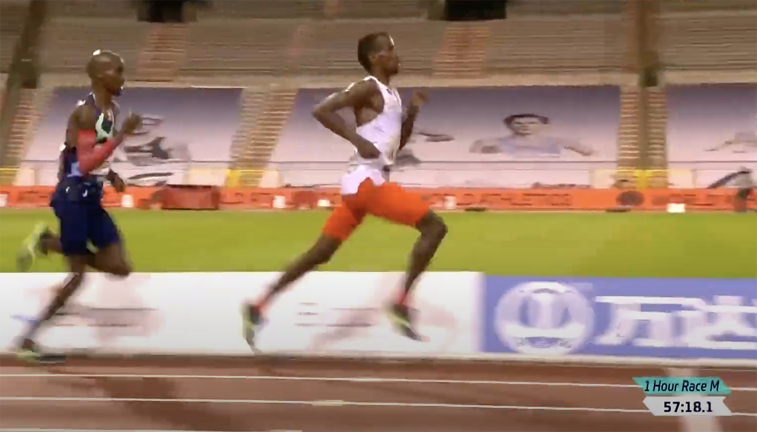 Hassan 的耐力也不是省油的燈,緊咬 Kosgei 不放,甚至在 55 分鐘時超車領跑;Kosgei 不放棄在 56 分鐘時再度超車,59分鐘時 Hassan 使出場地賽的速度開 turbo,在半分鐘內拉開 50m 的差距勝出,成功刷新世界紀錄,最後一圈大約只花了 65 秒!