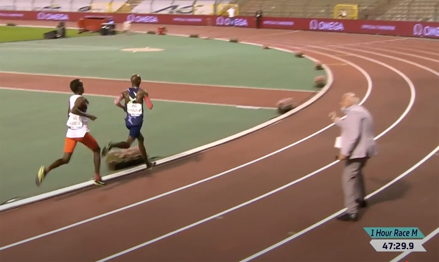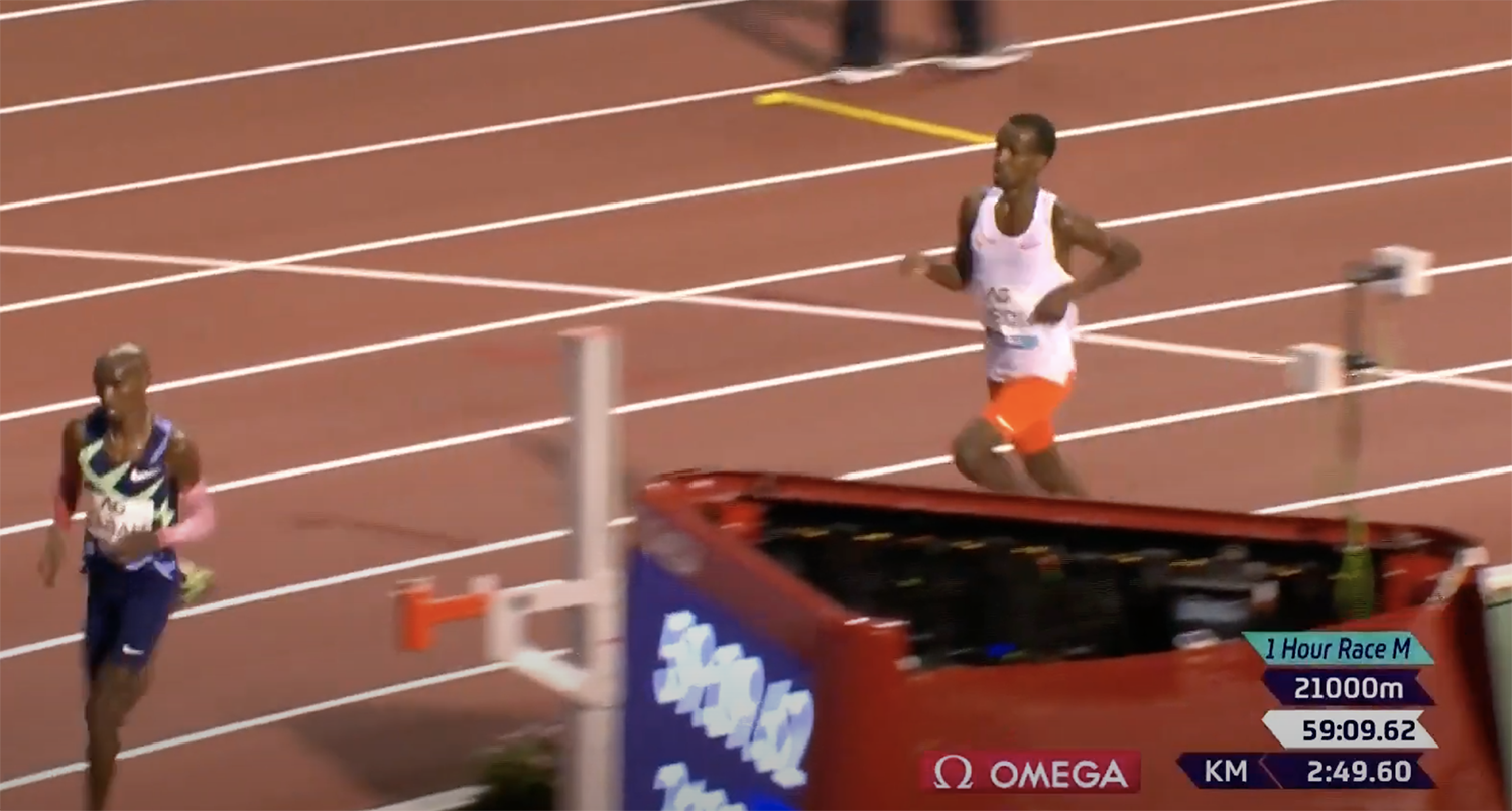 Mo Farah 跑出 21330m 成功超越長跑皇帝 Haile Gebrselassie 十三年前創下的 21285 世界紀錄,這是 Farah 的第一個室外場地賽世界紀錄,這個非奧運、鮮少舉行的項目,其實有著偉大的傳承,各世代長跑傳奇人物 Paavo Nurmi、Emil Zatopek、Ron Clark 和 Haile Gebrselassie 都保持過這個紀錄,此成就稍微平衡了 Farah 只會搶獎牌的名聲。