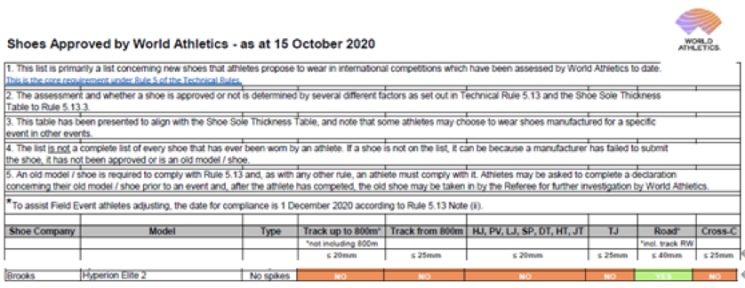 其中一條規範明定「鞋款必須在公開的零售市場(線上或者實體店面),至少販售四個月,才能用於賽場上」,使得各家跑鞋紛紛趕在原定2020年7月舉辦的東京奧運前四個月上市。雖受COVID-19疫情影響,東京奧運延期,但世界田徑總會的審核並沒有因此延期。