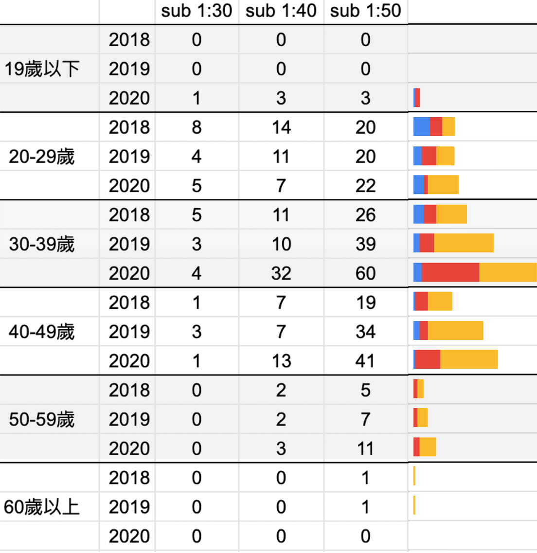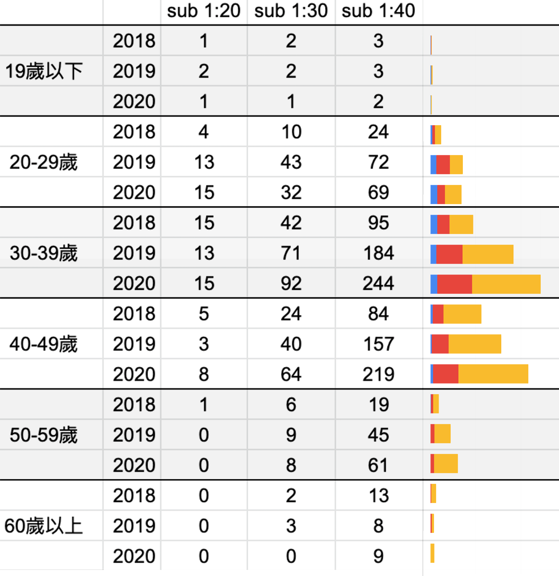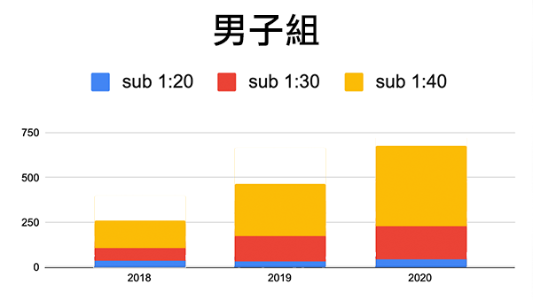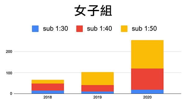 從整體成長趨勢來看,1:20、1:30 內都有成長外,1:40 內顯著成長,顯示進階跑者(有練過)急速成長!