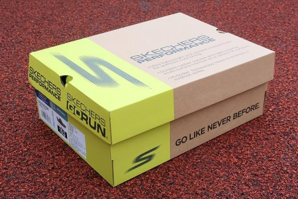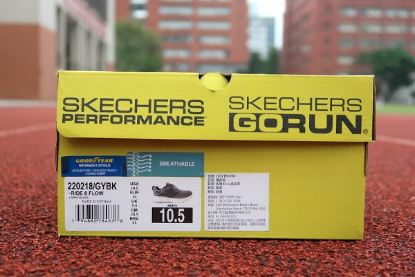 「SKECHERS GORUN RIDE 8 FLOW」鞋盒亮眼,外盒上標示型號尺寸與配色。(圖片來源:小賴)