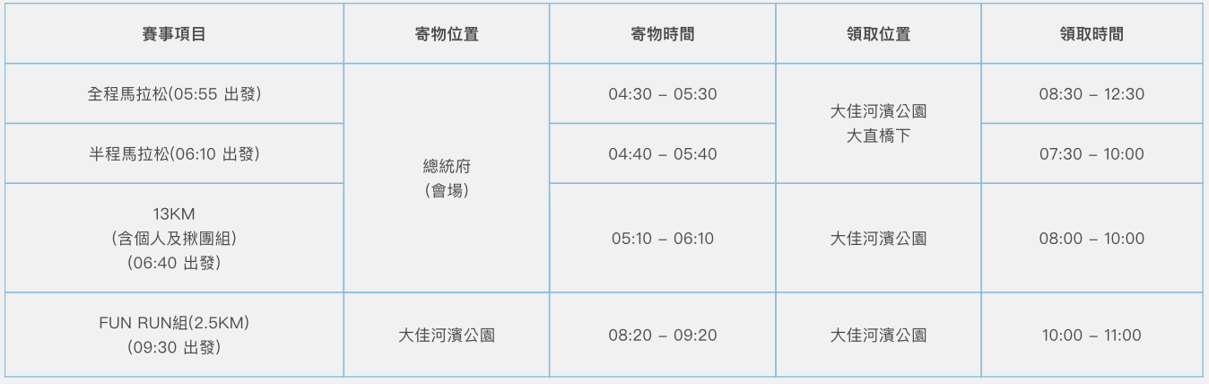 各組別寄領地點及時間一覽表(資訊來源:渣打臺北公益馬拉松官方網站)