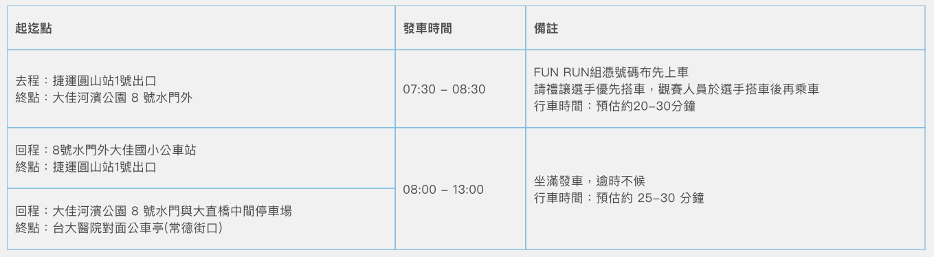為了方便跑者們在起訖點移動,主辦單位特別安排了接駁公車。請各位跑者特別留意起迄點的位置與發車時間!