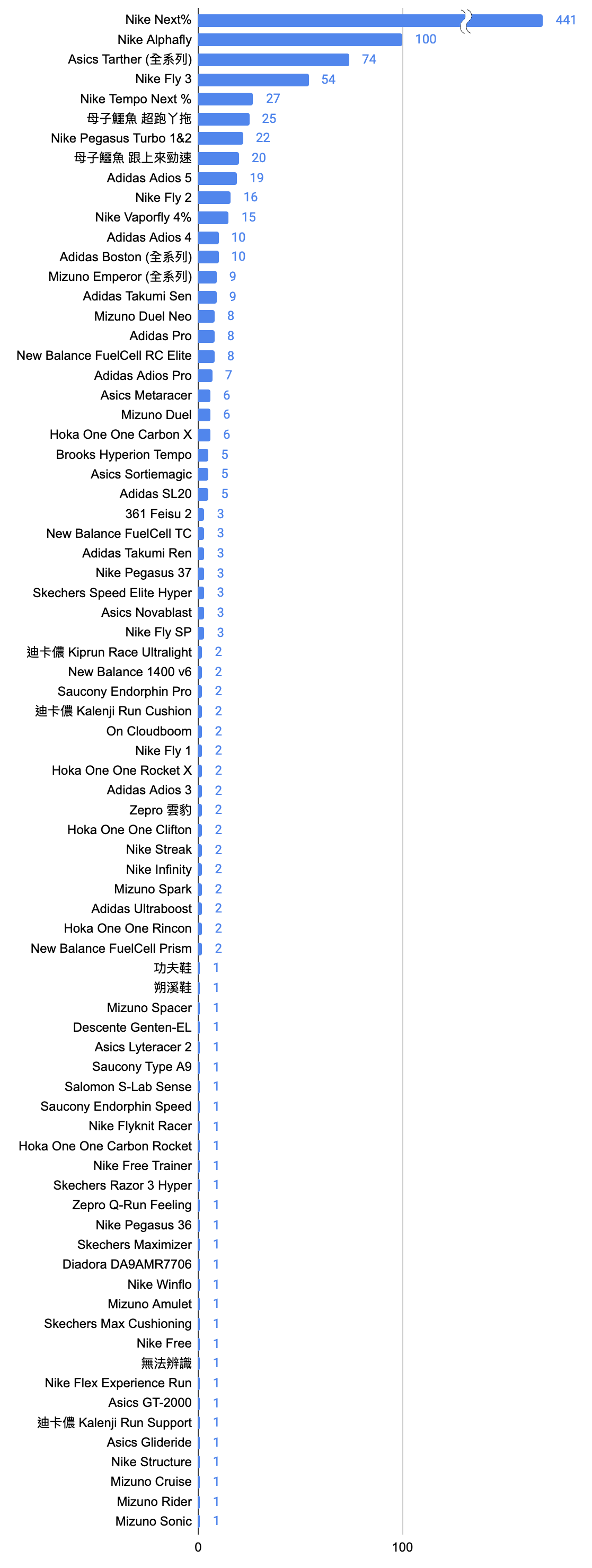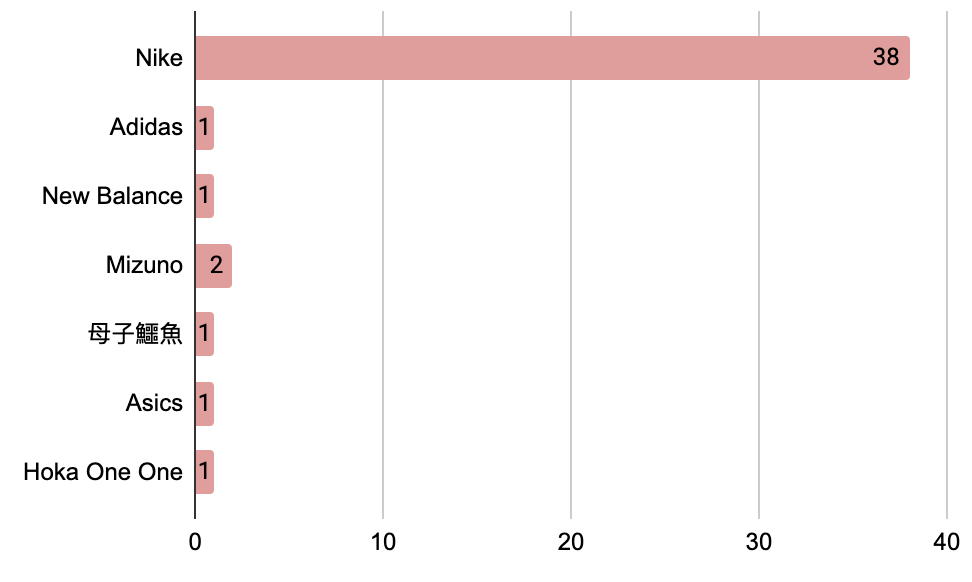 2020 年台北馬拉松為大多數跑者珍貴創 PB 的機會,大家無不穿上最滿意的戰靴應戰,今年筆記【跑鞋研究室】再度紀錄了完賽四小時內的跑鞋,並統計了前 1000 雙完賽跑鞋的品牌、型號,以下為全部數據。