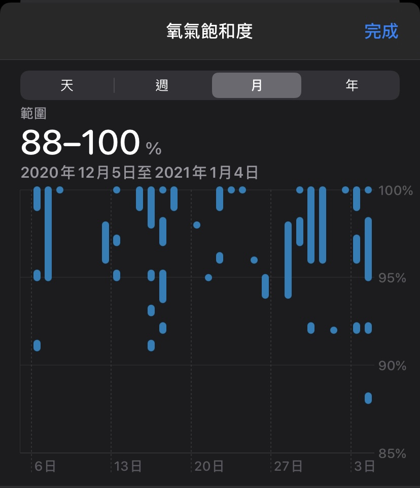 一般來說,運動時的血氧濃度較低,我也是這次使用了血氧濃度偵測的功能才發現自己在跑步時、重訓時以及睡覺時的血氧濃度都偏低,或許與呼吸方式或鼻子因天候因素過敏有關,後續也會持續追蹤,若仍有此狀況可能還需要去做進一步檢查。