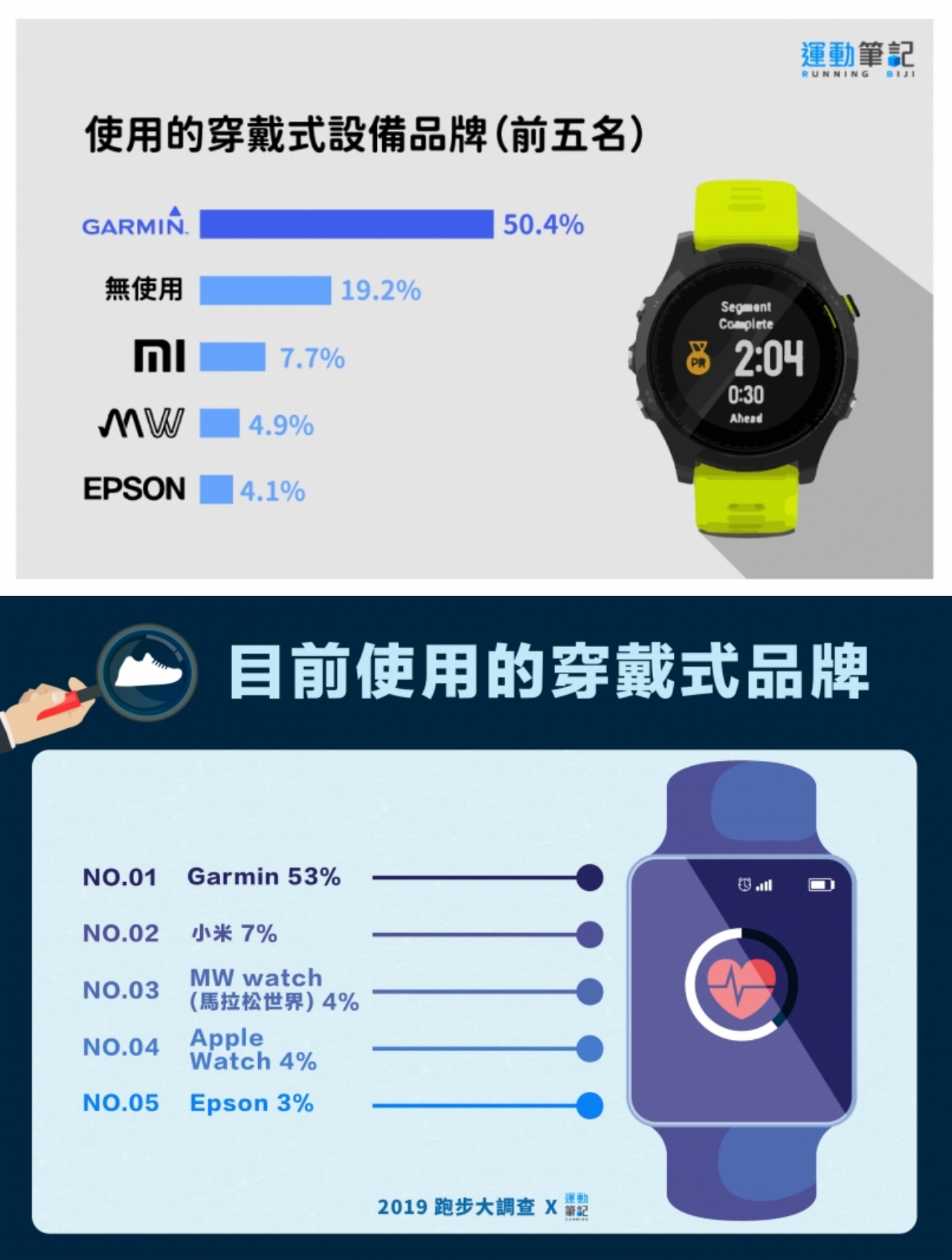 根據運動筆記 2019 年跑步大調查顯示,跑友使用的穿戴式裝置,仍由 Garmin 一枝獨秀,超過近半數答題者選擇它,而 Apple Watch 用戶則從 2018 榜外無名擠進第三(與 MW Watch 並列),原 2018 年回答無使用者則大幅下降,在其他選項未有大幅變動情況下,顯示不少開始使用穿戴式裝置的跑者都選擇了 Apple Watch。(延伸閱讀:【2019跑步大調查】跑友最愛的跑步裝備?NIKE、Garmin 獨霸)