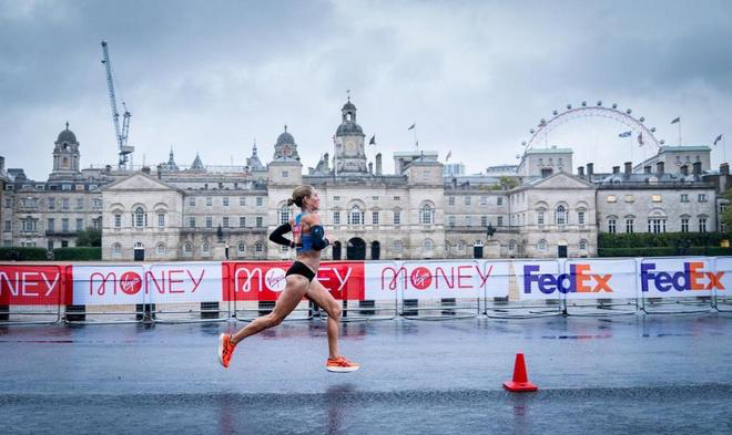 她現在目之所及的地方,看不到任何一個女選手,這是 2020 年的倫敦馬拉松,她現在落後領先集團大概 1 分鐘,在她身後的人群差她 45 秒,她現在已經沒有心思去查看自己的分段配速了。