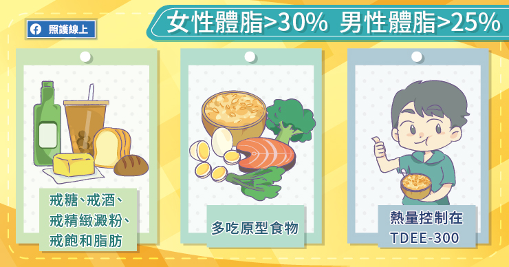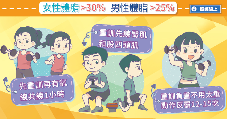 如果剛開始你的體脂和體重都很高,男性體脂率超過 25%,女性體脂率超過 30%。就要先採取以下的方式減脂: