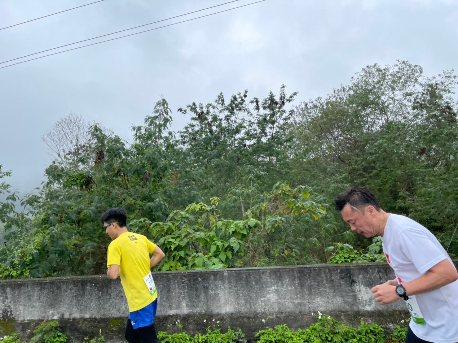 第 10K 到 20K 沿著海拔高度 300公尺左右新武呂溪邊山腰跑,天已微亮,雖有高低起伏,但尚稱平緩;雨已停,雲層仍厚,非常舒服的一段。20K 到 30K 開始爬坡,經過滴水、彩霞、嘉寶等等隧道到達海拔 712 公尺的天龍飯店,再往前跑近 2 公里,就達到折返點(原訂向陽、儷園的折返點因道路施工而改路線),第一個 30 公里用了 3 小時 22 分鐘。天龍飯店對面設有鹹粥的熱食補給(超愛那豆腐乳,中午則改為滷肉飯),吃了兩碗,帶著口腹的滿足下山。