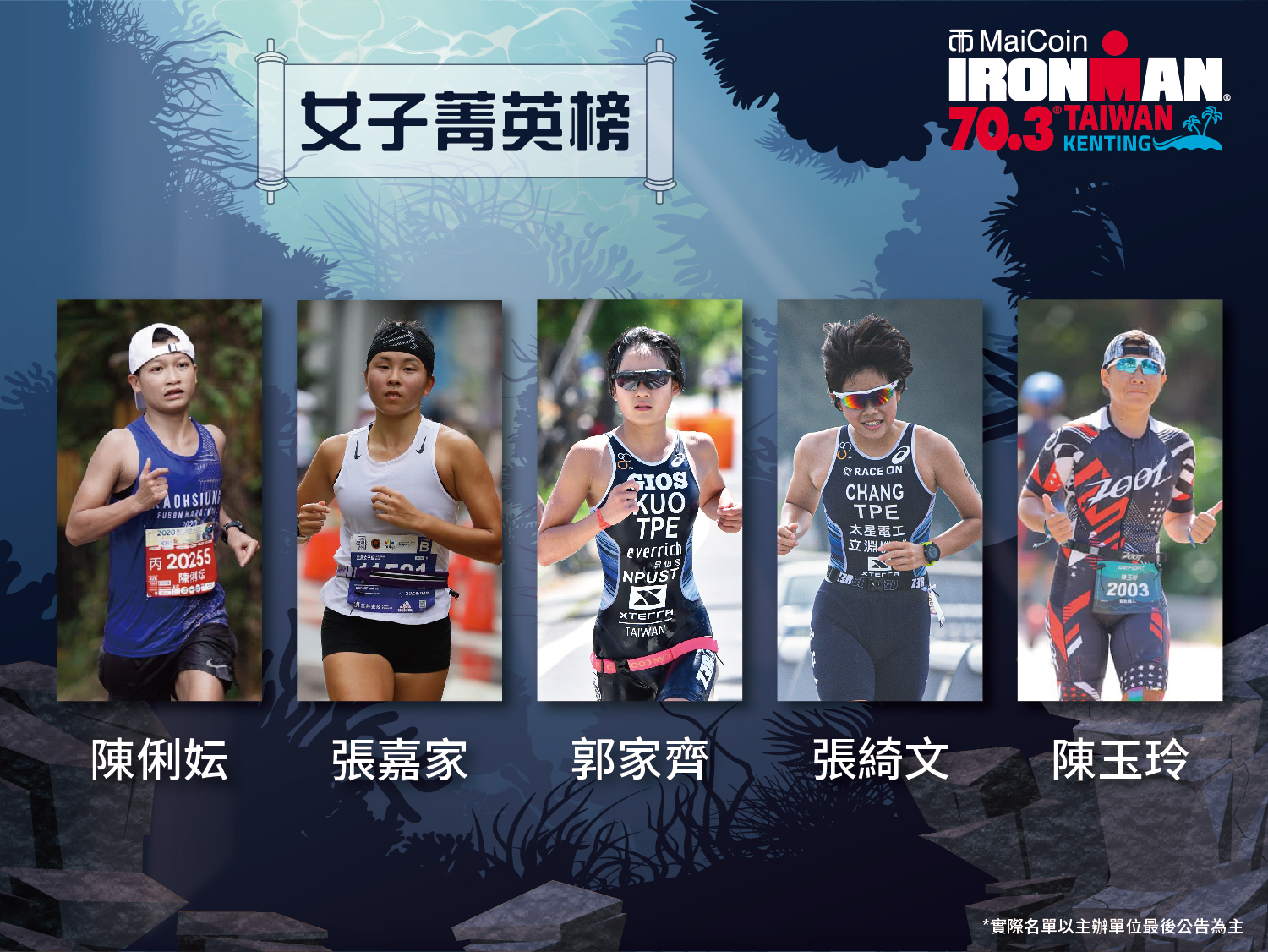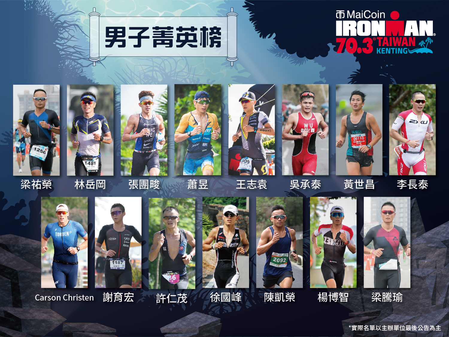| 「2021 MaiCoin IRONMAN 70.3 Kenting, Taiwan 墾丁國際鐵人三項賽」 賽事日期:2021 年 4 月 25 日 (星期日) 賽事地點:屏東縣墾丁小灣 賽事距離:113 公里 ( 個人 / 接力 ) 菁英男子個人組名單: 蕭昱、張團畯、王志袁、徐國峰、許仁茂、陳凱榮、林岳岡、梁祐榮、吳承泰、 謝育宏、梁騰瑜、黃世昌、李長泰、楊博智、Carson Christen 菁英女子個人組名單: 郭家齊、張綺文、張嘉家、陳俐妘、陳玉玲 |