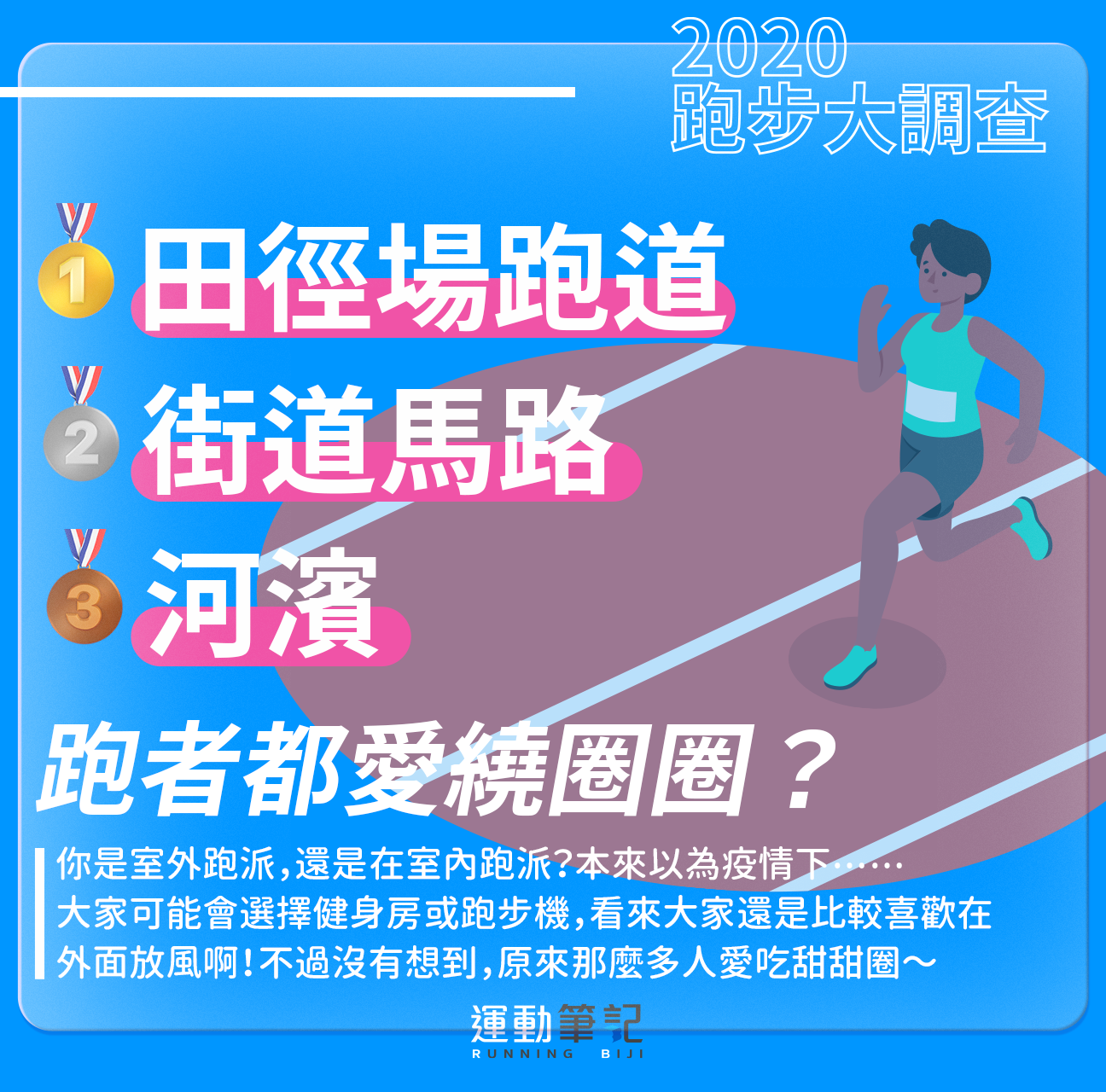 雖然在 2020 經歷了疫情,但仍不減人們想要在外跑的慾望!最多人喜愛在操場「吃甜甜圈」,其次是在街道馬路上跑,第三名喜愛跑的地點是河濱。