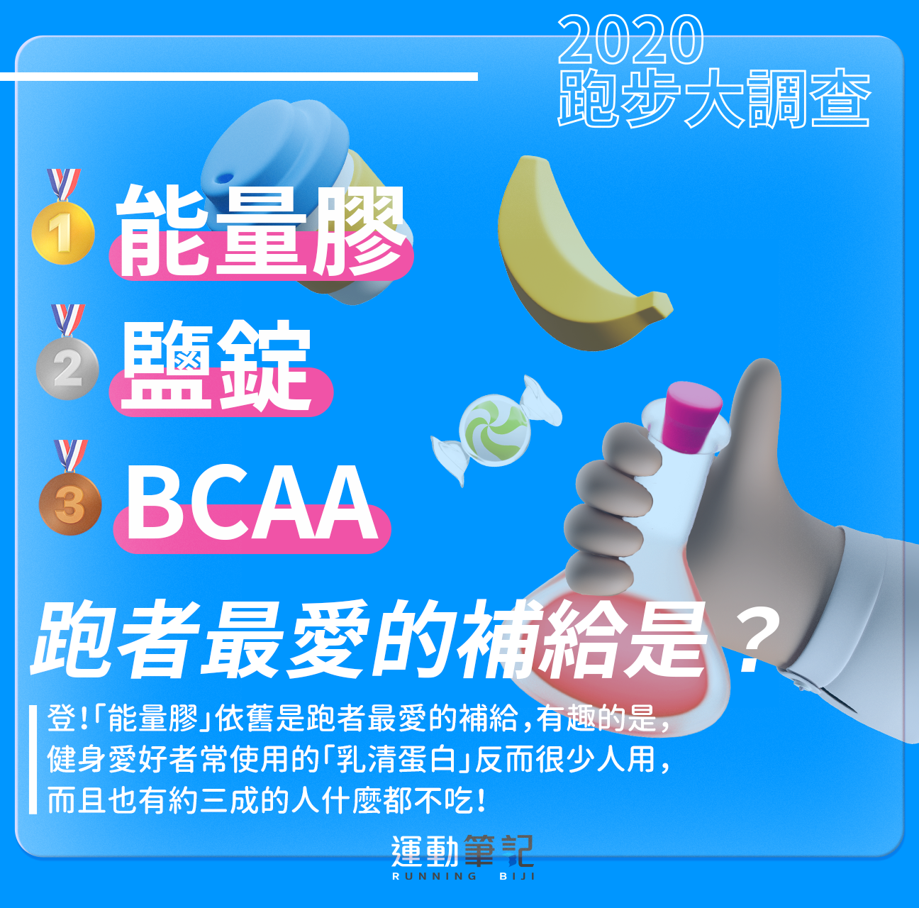 跑者的「補給三寶」能量膠(40.3%)、鹽錠(38.3%)和 BCAA (30.6%)再度名列前三,不過有趣的是,往年鹽錠皆勝過能量膠,在 2019 年的時候兩者出現黃金交叉,而 2020 年能量膠的愛好已經超越了鹽錠!