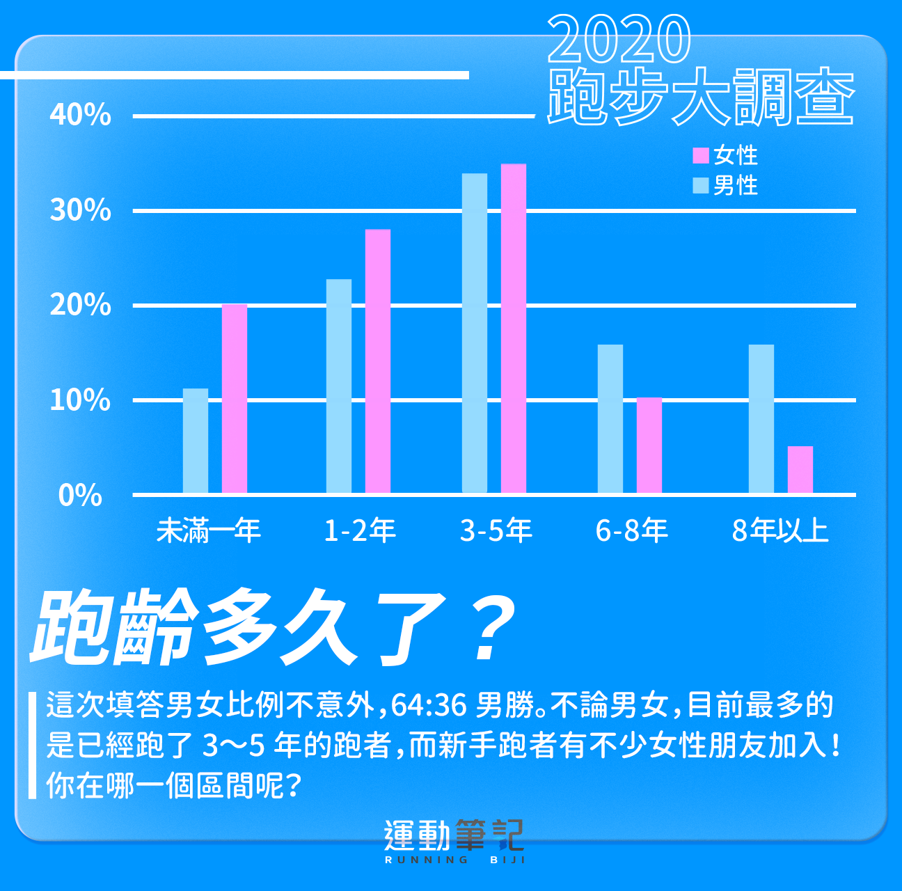 根據統計,在跑步人口結構中,這次填答的男女比為 64%:36%,在跑齡的部分,男女皆以 3~5 年最多,其次是 1~2 年,而跑齡 6 年以上的男性跑者遠多於女性,未滿一年的男性則少於女性。這也顯現出男生較早進入跑圈,而近年越來越多女孩們開始加入的趨勢!