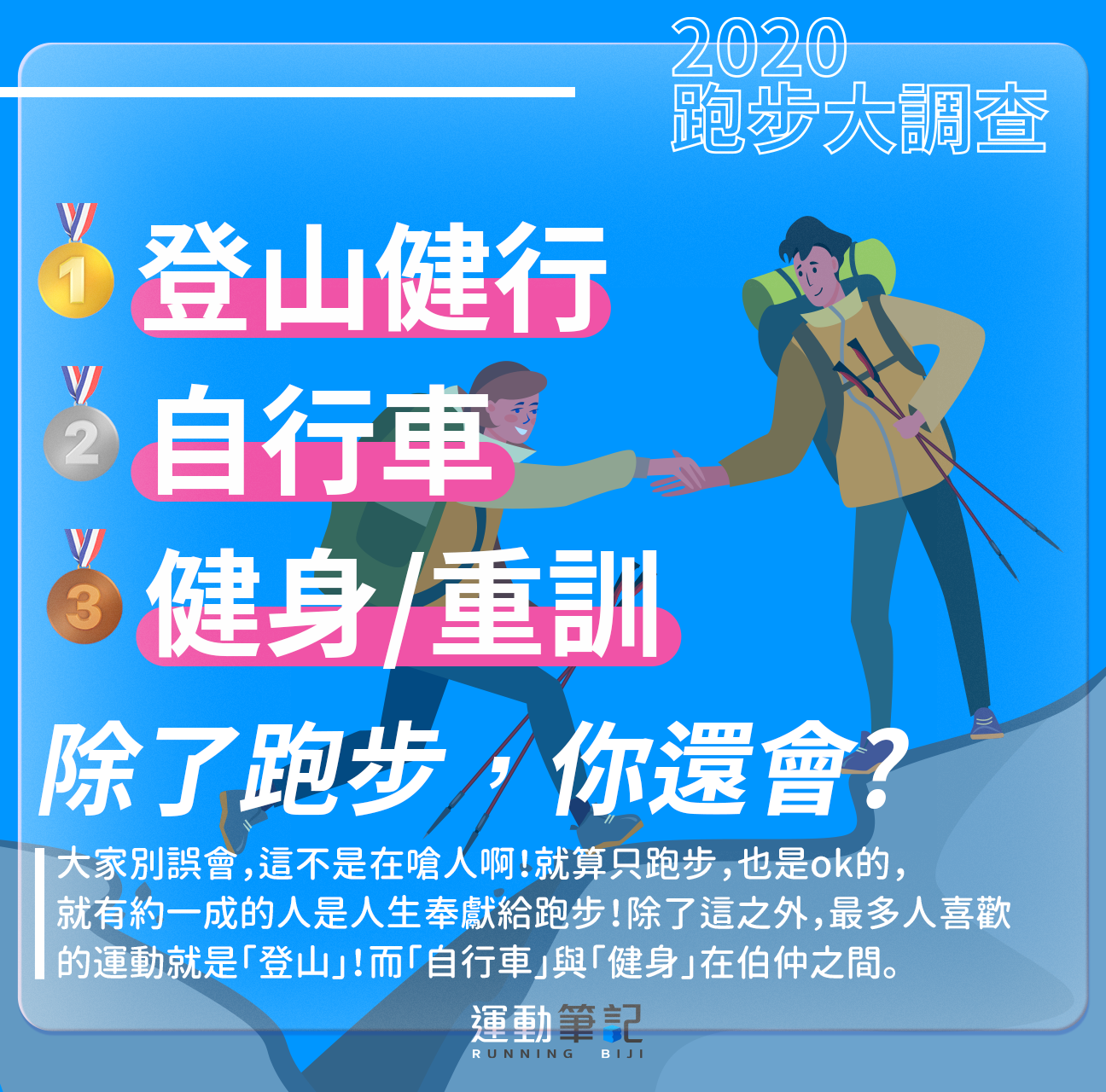 別誤會,這句話可不是在嗆人,全心全意奉獻給跑步的人,小編可是很敬佩的!除了跑步之外還會從事的運動中,這次依舊是登山(46.2%)、自行車(36.7%)與健身(35.6%)名列前三,接著是球類運動(20.2 %)、水上運動(15.3%)以及瑜珈(12.0 %)。